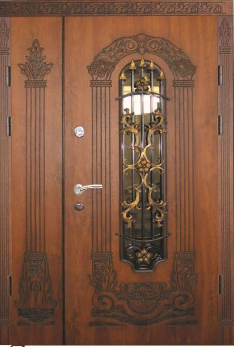 Поскольку в большинстве случаев устанавливаемые на входе в коттедж двустворчатые двери являются еще и предметом интерьера, украшающим здание, их дизайну предается особое значение. Эти двери, как правило, отделываются атмосферостойким МДФ, натуральным шпоном, массивом. Эффектно на таких дверях смотрится витражный узор, применение ковки, зеркальных элементов. Вариантов декора входной двустворчатой двери масса, тут все зависит от пожеланий заказчика.